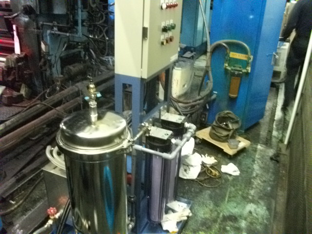大阪府N社に湿し水濾過装置を納入しました 2016/04/05 導入実績 N社様には2台目となる、オフセット輪転機の湿し水をフィルタで循環するシステムです 手前がゴミトリフィルタで、その奥に見えるのが、インキ吸着エレメントです 制御盤です、全て自動運転になっています