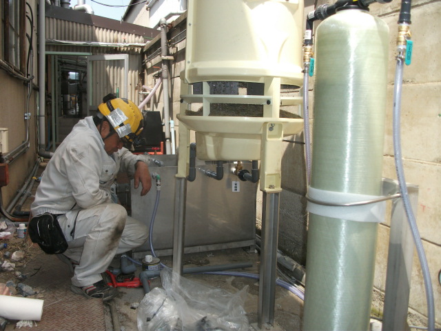 大阪府C社に追加設備の導入です 2017/06/10 導入実績 以前、Pb(鉛)除去システムを導入させて頂いたC社様に、今度は工場内の冷却水循環ラインを導入 しました。クーリングタワーも古かったので、更新しました。 フィルタシステムの設置風景 手前から、バッファタンク→クーリングタワー→フィルタユニットの順番 最後の試運転前の調整をしているところです