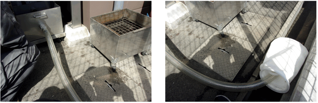 左:排水用ホースを取り付けたところです